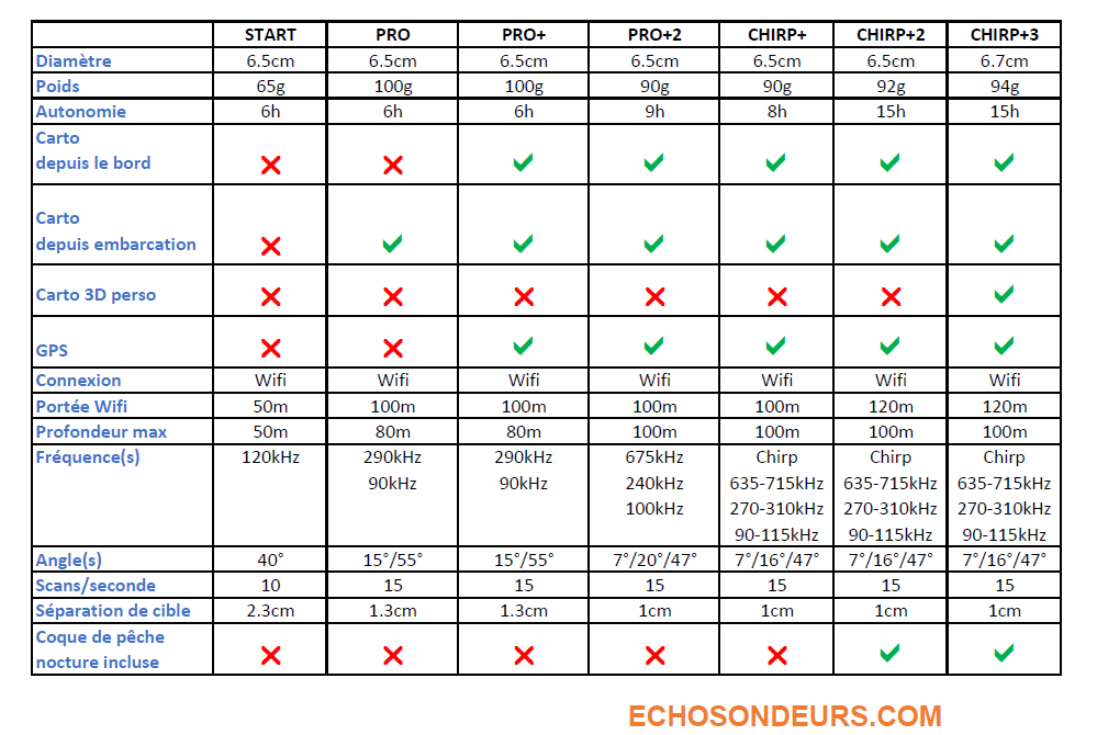- Si les PRO, PRO+, Chirp+, Chirp+2 et Chirp+3 partagent la même coque sphérique, la Start arbore un profil plus élancé, néanmoins le diamètre de 6.5cm est commun aux trois modèles. Ces sondes se glissent facilement dans n’importe quel sac pour le transport.