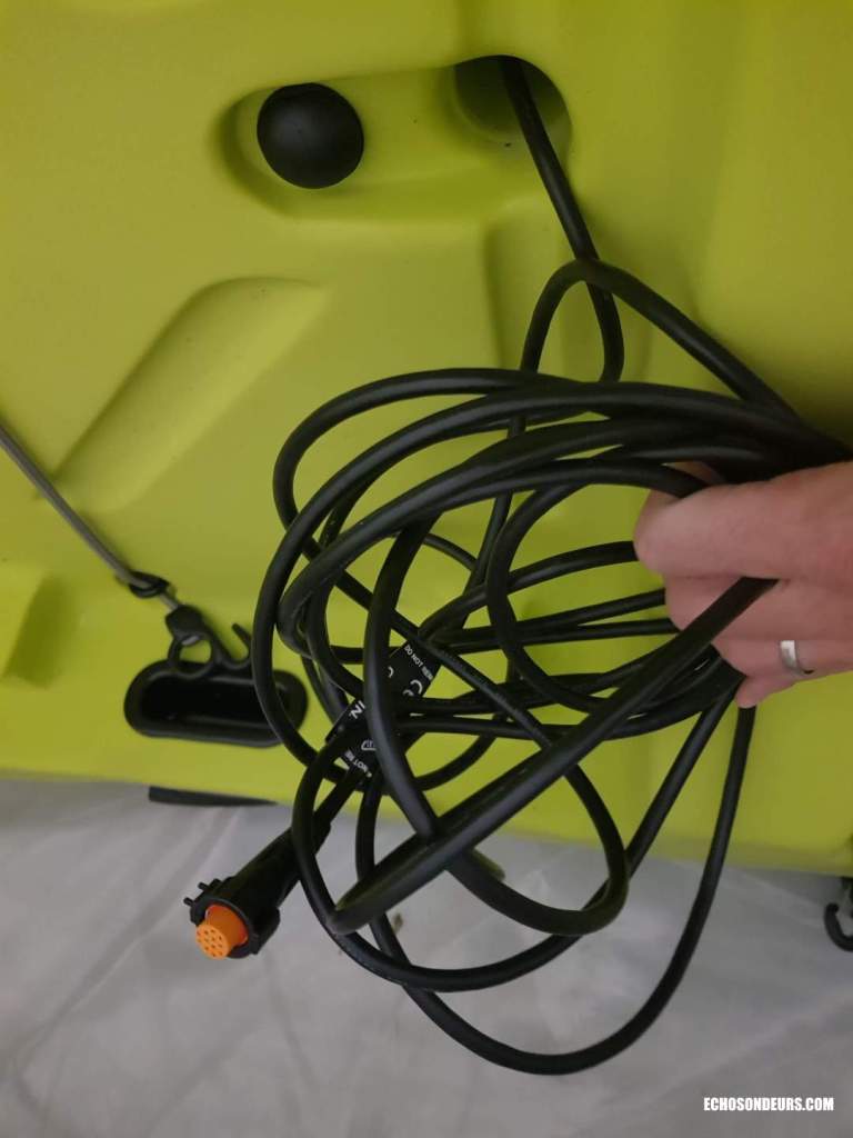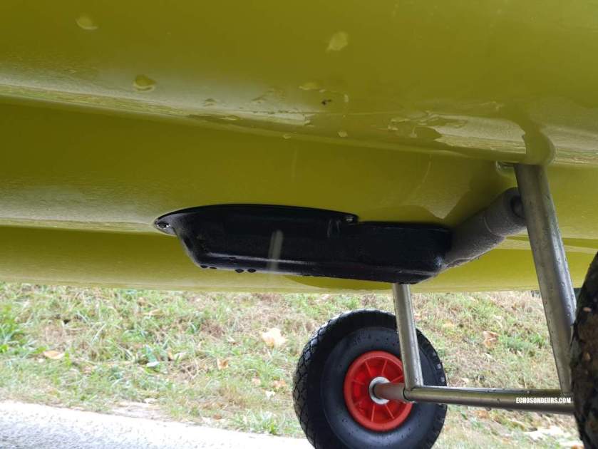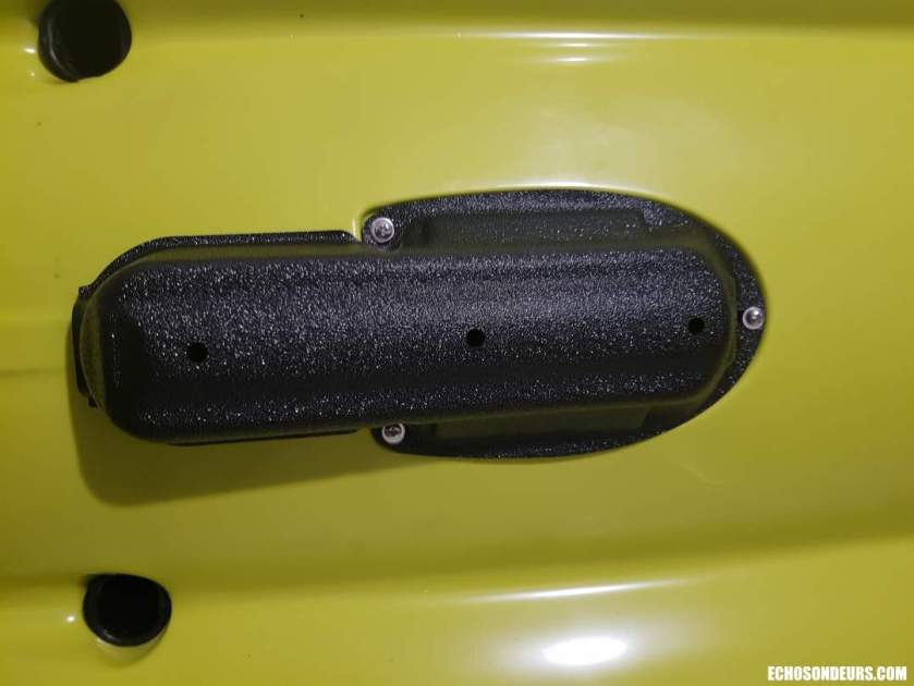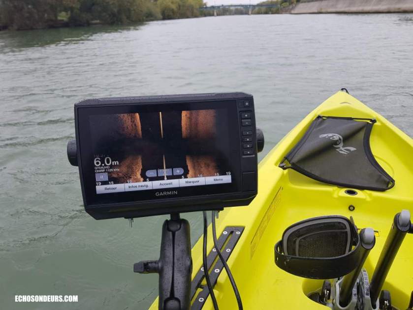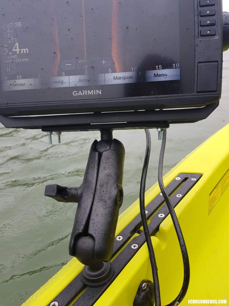 Concernant le sondeur, j’ai opté dans un premier temps pour un Garmin Echomap UHD 92sv. L’écran est maintenu par un support RAM très sécurisant. La taille de l’écran en 9″ est la limite haute acceptable selon moi pour un kayak de ce genre. La sonde Garmin GT54UHD est placée sous la coque à l’emplacement du puits de sonde avec une coque protectrice fabriquée par BerleyPro et distribué en France par Savager’s ou sur ebay. En plaçant la sonde sous la coque vous n’avez aucun risque de mal la monter puisqu’elle est placée parfaitement à l’horizontal. L’avantage du système de propulsion Mirage Drive est de fournir des images side imaging assez claires puisque le kayak file droit. A noter que toutes les sondes actuelles du marché sont compatibles avec les solutions BerleyPro.