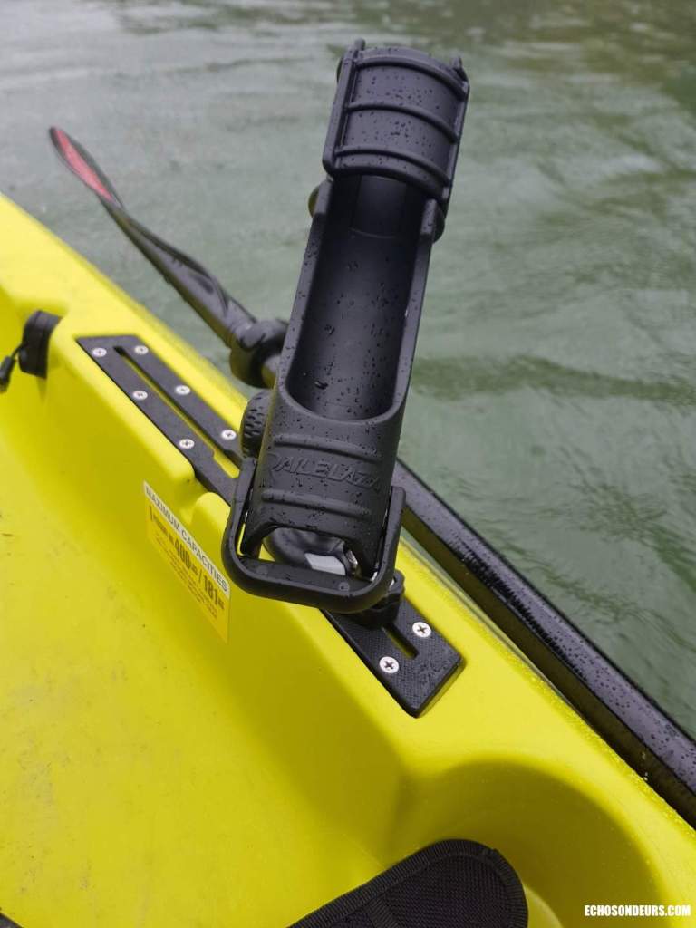 En matériel supplémentaire j’ai opté pour un porte canne Railblaza, dimensionné pour des grosses cannes il est capable de sécuriser n’importe quelle canne du commerce.