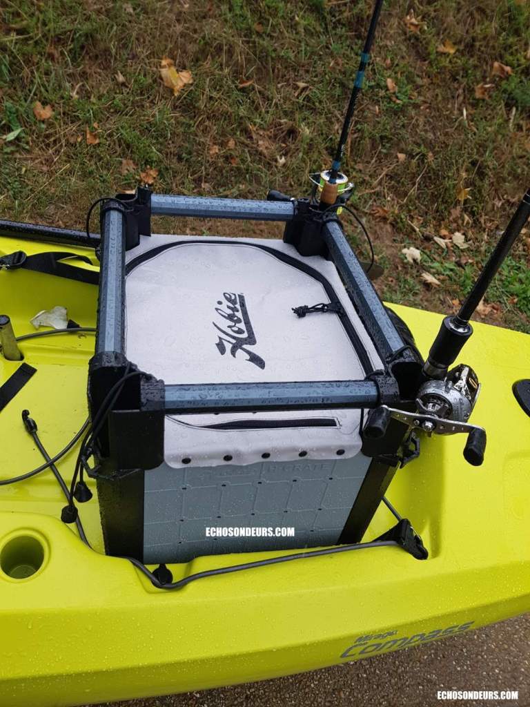 Derrière le Kayak, sur la plateforme j’ai ajouté une caisse Hobie H-Crates avec le couvercle. Cette caisse est maintenue au kayak par quatre attaches. En cas de retournement l’équipement est ainsi sécurisé. Sur le H-Crates il est possible de rajouter des accessoires comme une boite pour ranger ses petits ustensiles comme les pinces et tout ce dont on a besoin d’avoir rapidement sous la main. Il est également possible d’embarquer sur le H-Crates quatre cannes dont il est possible de les sécuriser avec les petites sangles.