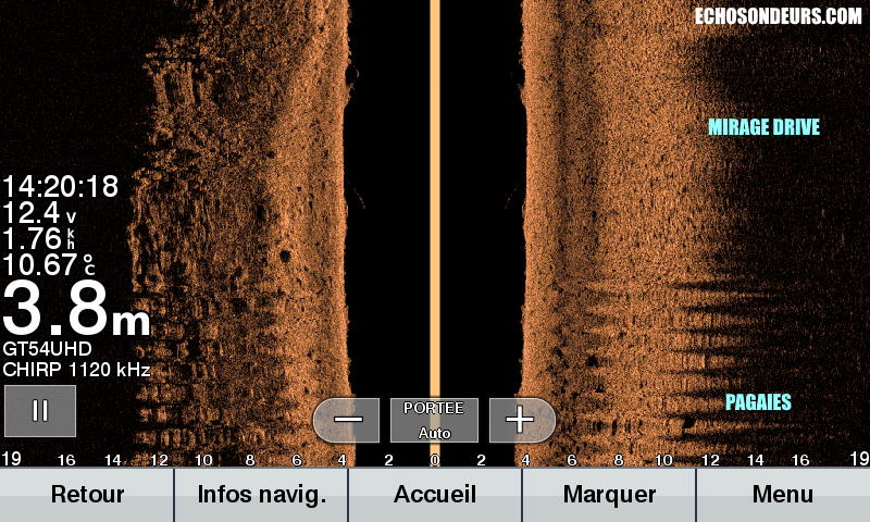 Le mirage drive 180 avec pale turbo me permet d’atteindre une vitesse de croisière de 5 à 6km/h. Je ne suis pas spécialement sportif donc quelqu’un endurant pourra peut être aller plus vite. En forçant un peu vous pouvez faire des pointes à 8/9km/h mais n’espérez pas tenir cette vitesse sur le long terme les cuisses chauffent rapidement. L’avantage non négligeable des pales ou des hélices sur les pagaies est que le kayak ne balance pas à gauche et à droite. Si vous prospectez avec l’imagerie latérale vous obtiendrez une image bien plus propre sur votre écran.