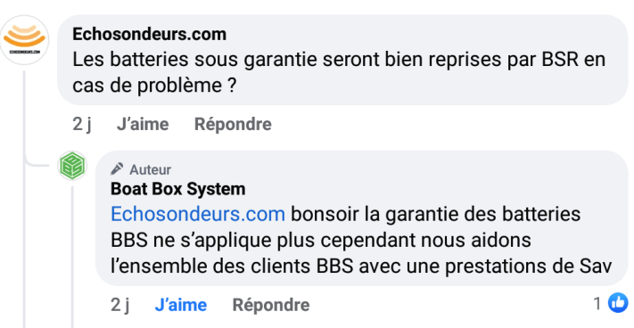Sur la page Facebook de Boat Box System, la société BSR indique qu’elle assurera le S.A.V. des batteries BBS mais qu’elle ne prendra pas en charge les garanties. A lire les commentaires sur les réseaux sociaux, l’inquiétude est palpable chez les détenteurs de batteries BBS achetées il y a moins de deux ans.