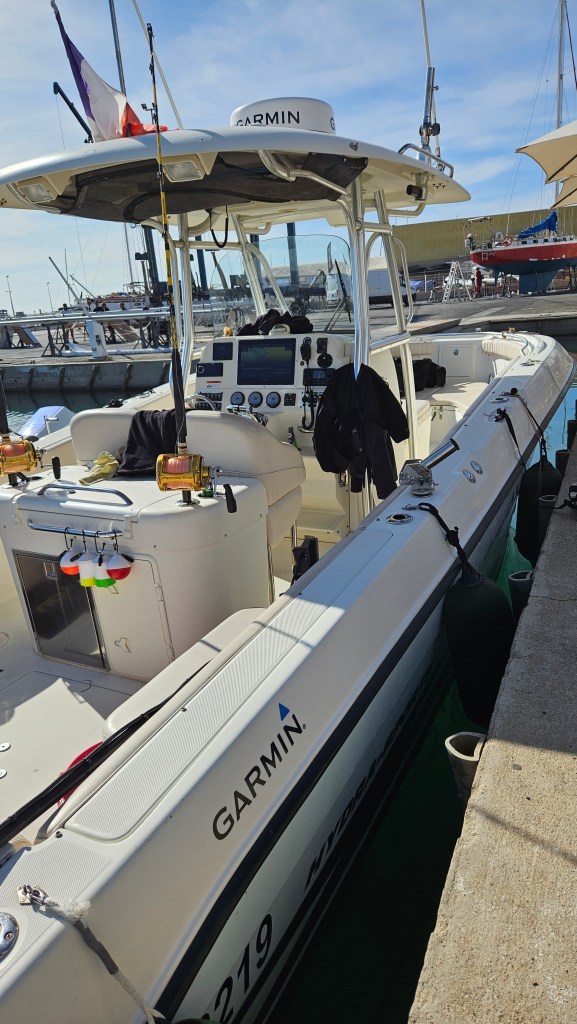 Le rendez vous est pris début octobre au lever de soleil sur un ponton du port de Frontignan dans l’Hérault. Le père et son fils, spécialistes de la pêche au broumé, nous attendent au bord de leur bateau Hydra Sports de 29 pieds équipé de deux moteurs Mercury 300 chevaux. Côté électronique, deux sondeurs GPSMAP; un 8416 encastré dans la console et un 8412 au tableau arrière sur support RAM. Tous deux reliés en Wifi pour le partage des sondes.