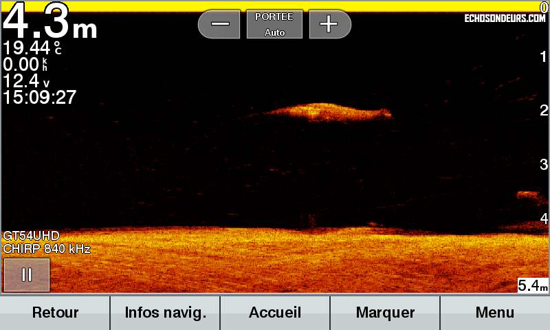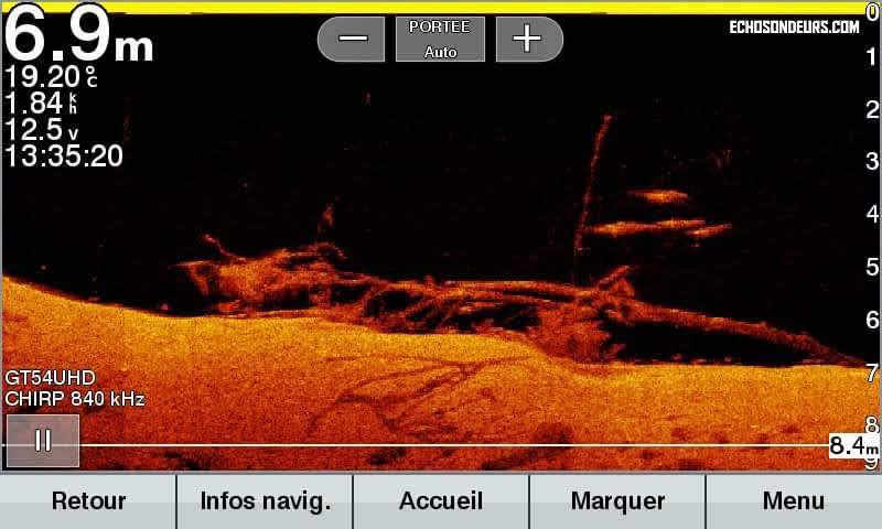 L’écran est tactile et réactif, la navigation entre les menus est fluide, l’ergonomie est bien pensé avec ce mix bouton/écran tactile. On peut juste regretter que la définition d’écran ne soit pas supérieure. La définition d’écran suffisante dans la plupart des cas peut être pénalisante en cas de partage d’écran (SideVü+ Carto + ClearVü par exemple). Le nombre de pixels alloués à chaque fenêtre pénalisera la précision de détection. Il faudra passer à l’Echomap Ultra pour partager ses fenêtres en toute aisance.