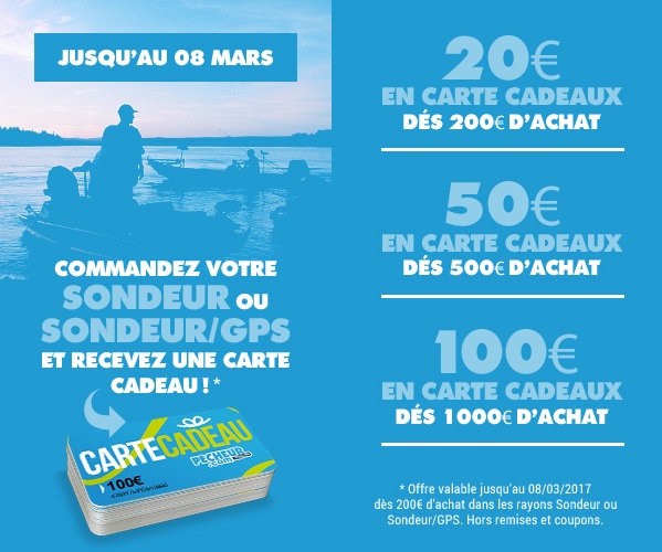 Jusqu'au 8 mars, pecheur.com propose jusqu'à 100€ de carte cadeaux pour un achat de sondeur.